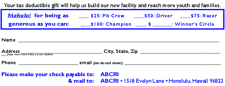 ABCRI DONATION CARD Please print this page, fill in the Donation Card below and mail along with your check (made payable to ABCRI) to:ABCRI1518 Evelyn LaneHonolulu, Hawaii 96822